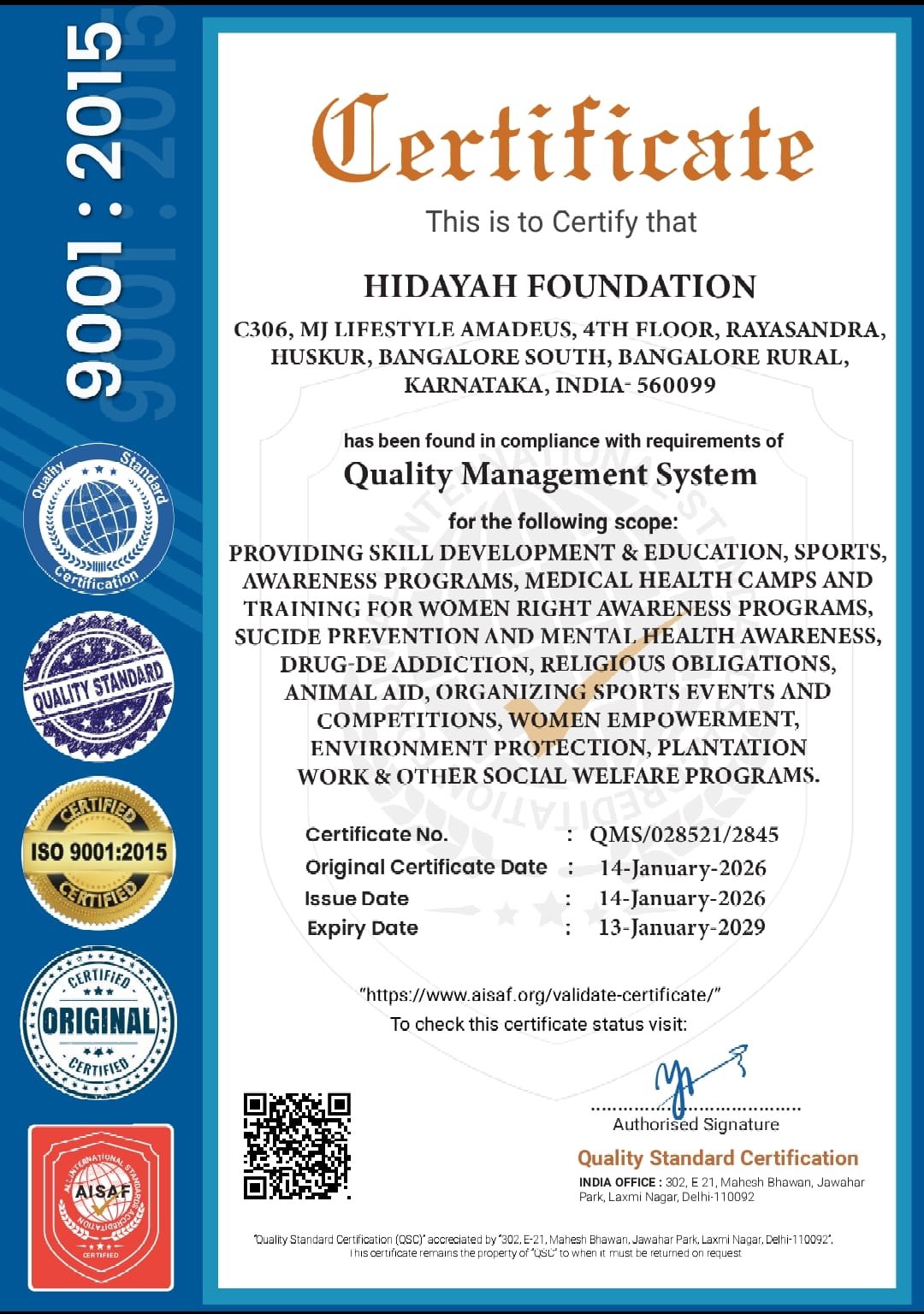 Disclaimer: Hidayah Foundation operates solely for charitable and humanitarian purposes. We are a registered Non-Profit Organization under Section 8 of the Companies Act, 2013. All donations are voluntary and eligible for tax exemptions under applicable laws.